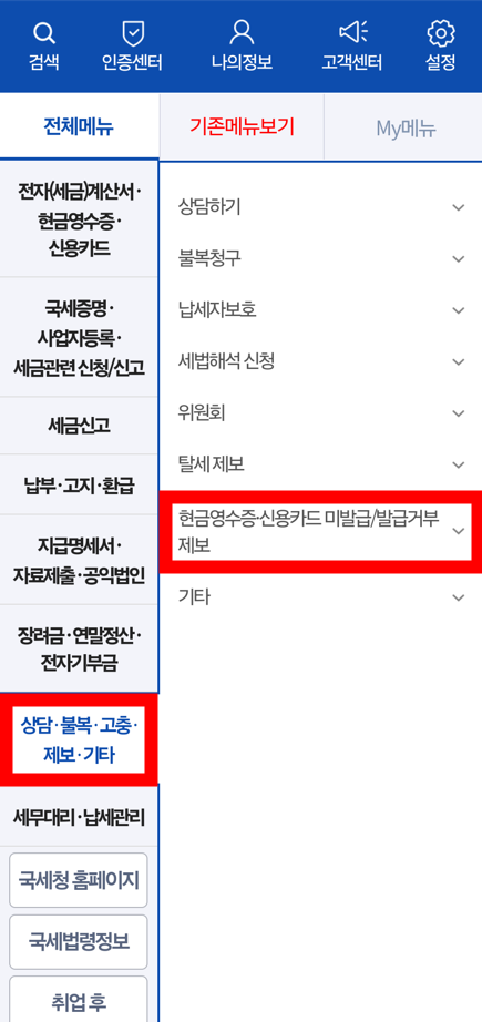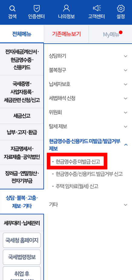 2. [상담/불복/고충/제보/기타] > [현금영수증/신용카드 미발급/발급거부 제보] 누르기