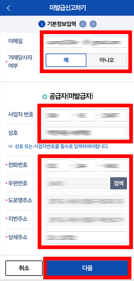 5. 기본정보 입력 > 거래한 판매자의 사업자 번호 또는 상호 입력(필수) > 전화번호 등 정보 입력 > [다음] 누르기