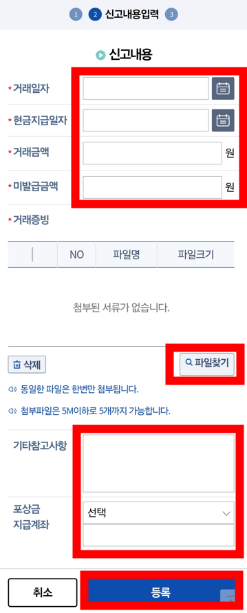 6. 신고내용 입력 > [파일 찾기] 누르고 계좌이체 내역이나 판매자와 나눈 문자나 카톡 캡처이미지 찾아서 업로드 > 기타참고사항과 포상금 받을 계좌 정보 입력 > [등록] 누르기